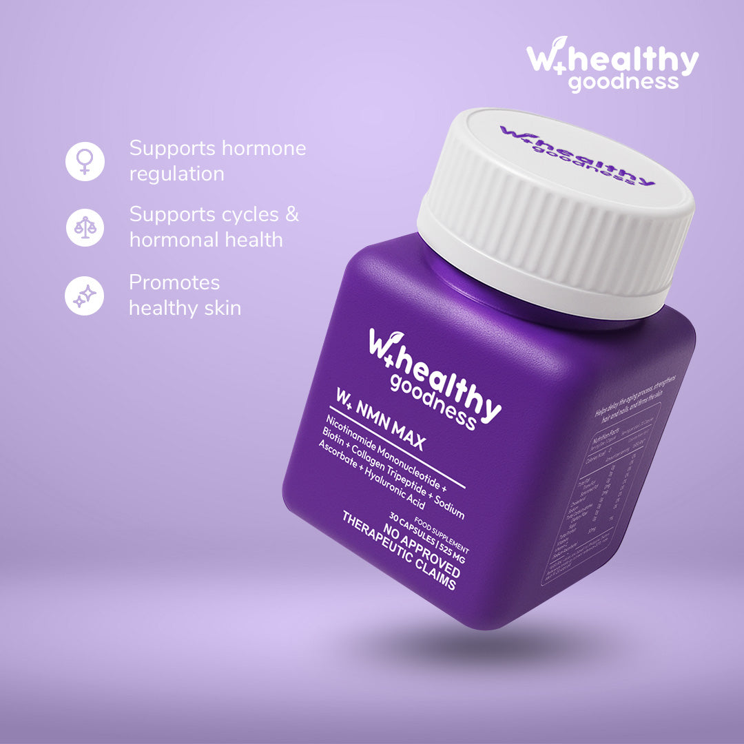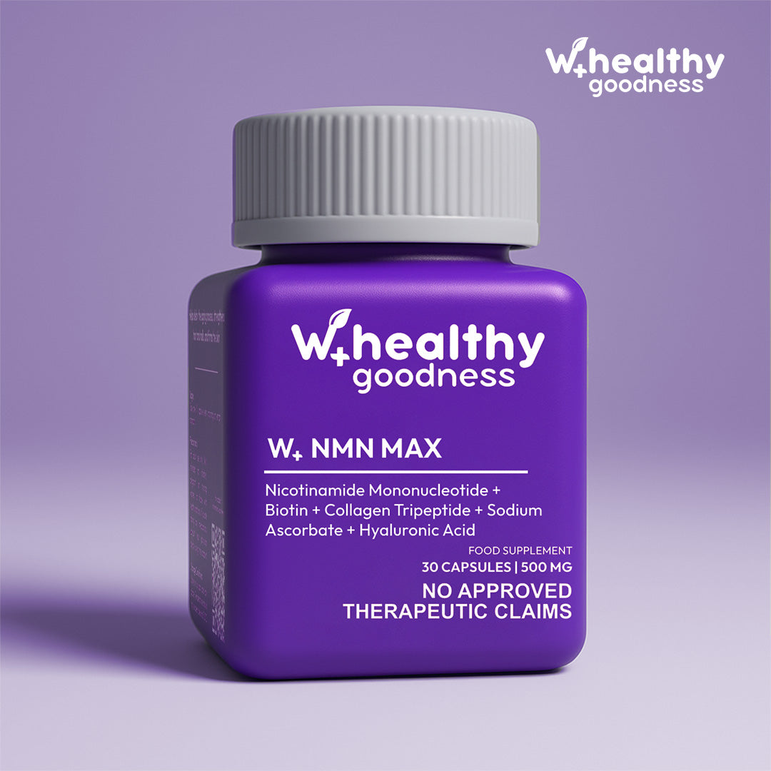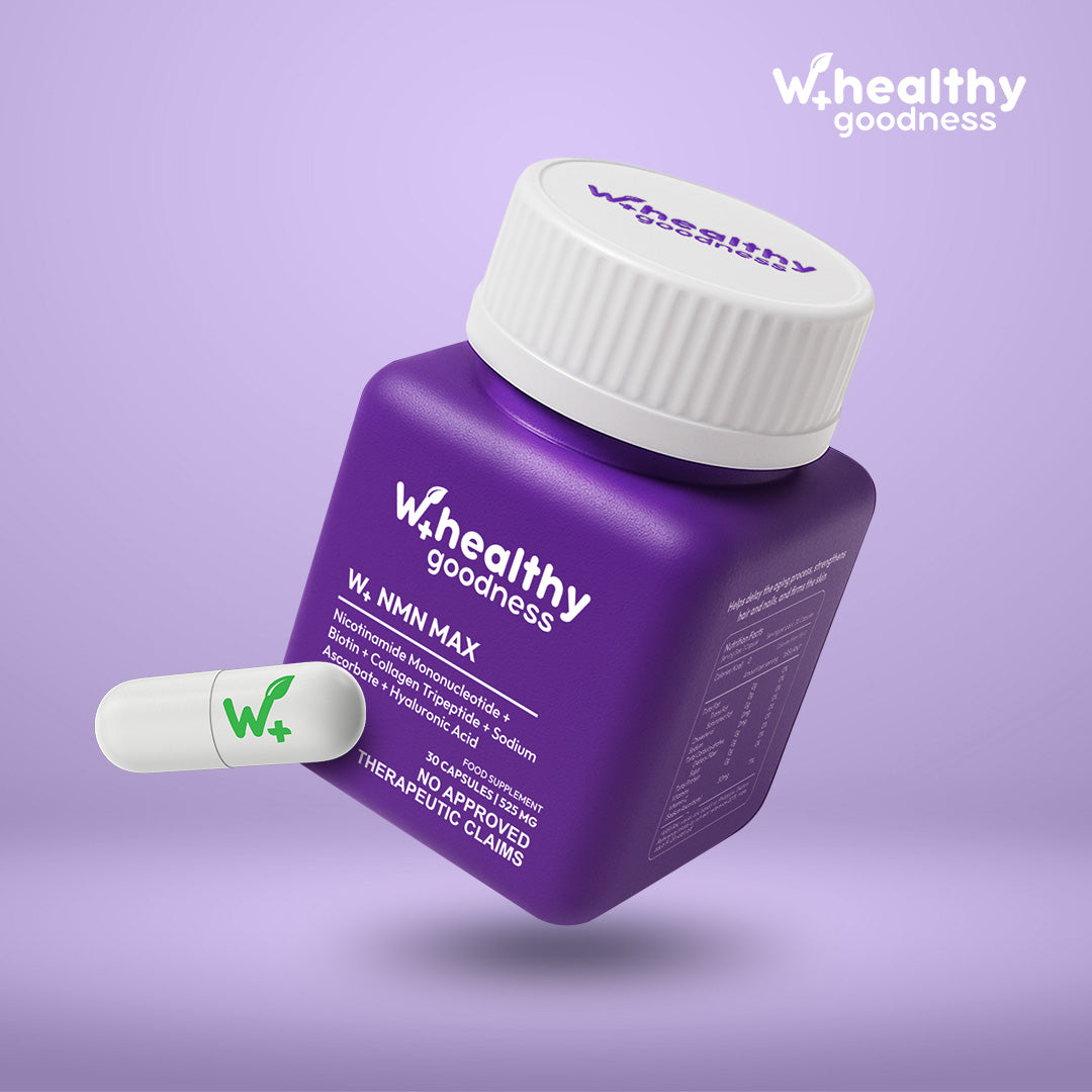 W+ NMN MAX is formulated to support skin health, energy, and visible signs of aging using NMN, biotin, and collagen tripeptide. It helps enhance skin elasticity, strengthen hair and nails, and promote overall cellular vitality.