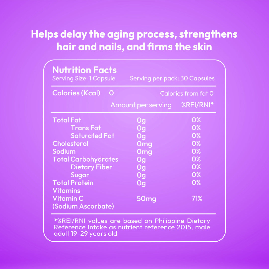 50mg Nicotinamide Mononucleotide, 100mcg Biotin, 350mg Collagen, 61.87mg Sodium Ascorbate, 5mg Hyaluronic Acid