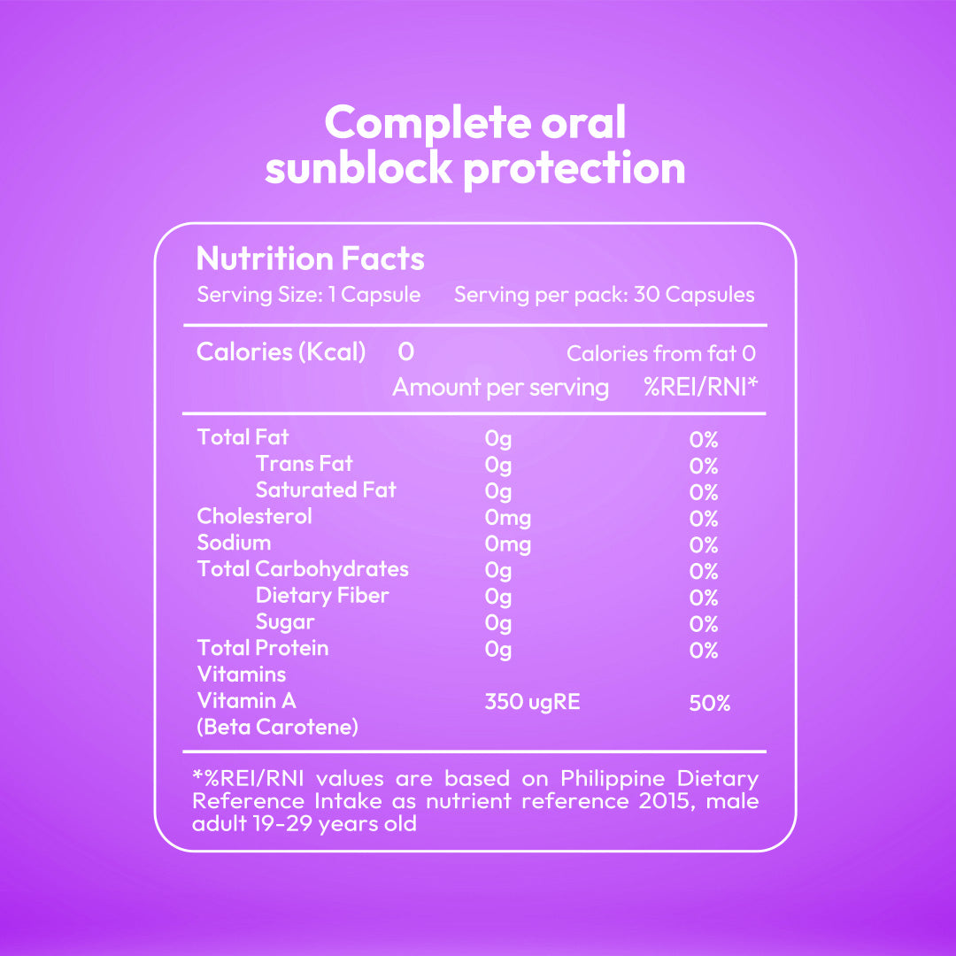 250mg Polypodium Leucotomos, 20mg Lutein, 550mcg Beta Carotene, 6mg Astaxanthin